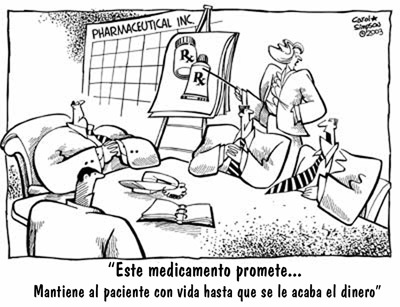 De 500 empresas farmacéuticas del mundo, 10 acumulan las mayores ganancias y 25 controlan 50% del negocio. Lo logran con presión publicitaria exagerada, monopolio de patentes, reducción de investigación eficaz; forzando leyes de apoyo a sus finanzas, dificultando el acceso a medicamentos reales, poniendo precios altos o represalias comerciales a fármacos genéricos, o crean falsas epidemias, involucran a médicos e incluso manipulan datos.