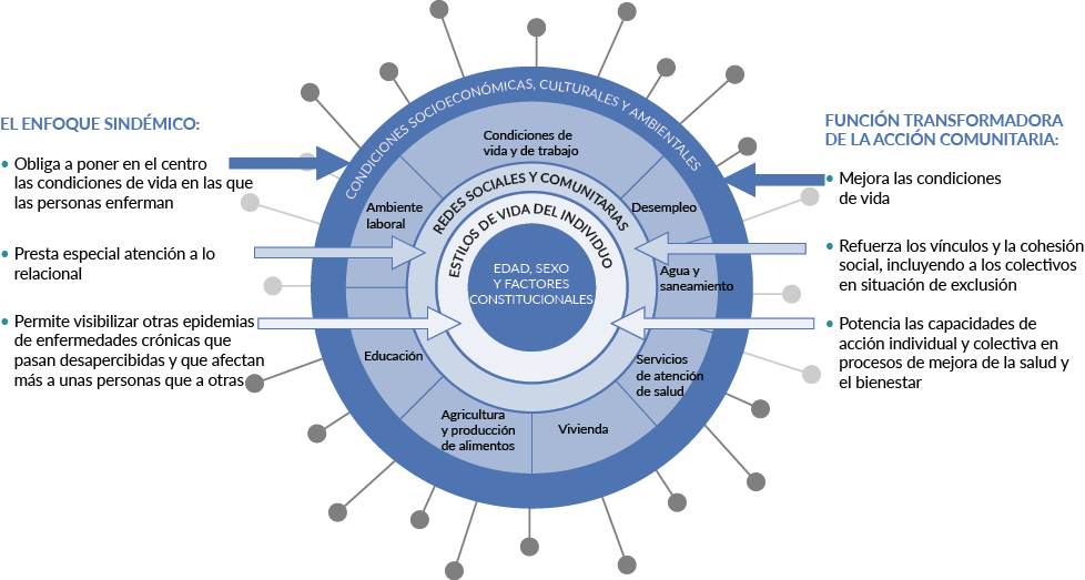 Como ya se ha expuesto, el enfoque sindémico remarca la importancia de abordar los determinantes sociales para mejorar la salud y el bienestar de la población, y la acción comunitaria tiene la capacidad de transformar y mejorar dichos determinantes. Es importante recordar que, mientras los determinantes sociales están condicionando la salud de las personas, hay en marcha otros procesos, en sentido inverso, en los que las personas y las comunidades actúan para transformar su contexto. Para que las intervenciones dirigidas a modificar los determinantes sociales y las desigualdades en salud sean efectivas deben hacerse a diferentes niveles, desde los más estructurales a los más individuales (11).