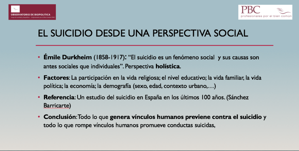 Decía Durkheim que “EL SUICIDIO ES UN FENÓMENO SOCIAL Y SUS CAUSAS SON ANTES SOCIALES QUE INDIVIDUALES”. La integración (cohesión social) social es un factor protector para los individuos frente al suicidio ya que encuentra un sentido a su existencia y reconoce en la sociedad una autoridad moral legítima (valores tradicionales aceptados) y se subordina a ella otorgándole el poder de decisión sobre su conducta y destino.
