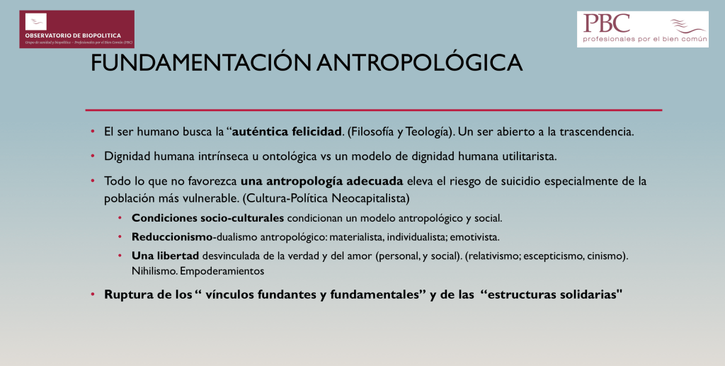 Pero no es posible afrontar el problema de suicidio sino se parte de una antropología adecuada que nos muestre tal y como es el ser humano.
