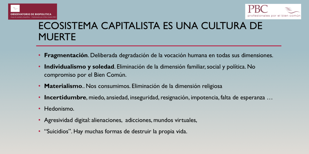 Una concepción antropológica adecuada materializada socialmente es fundamental para crear un ambiente social protector frente al suicidio. Sin embargo, la cultura actual: individualista, materialista y hedonista, ha reducido la dignidad humana hasta tal punto que ha generado un ecosistema pro-suicida. Las personas más vulnerables desde este punto de vista están cada vez más expuestas a un ambiente que ha roto o degradado las estructuras que conforman adecuadamente al ser humano.