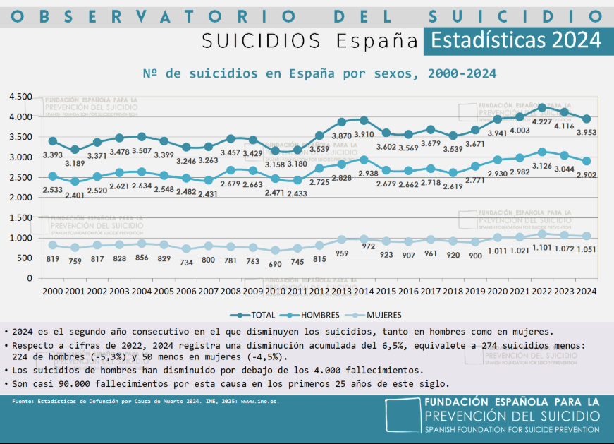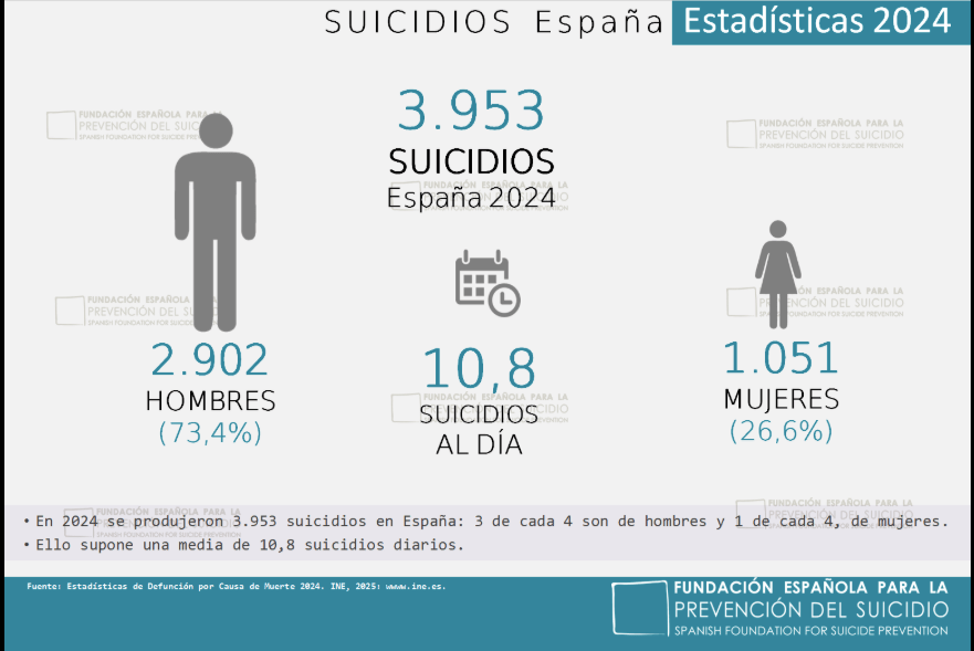 Y si nos detenemos a observar la situación en España, el suicidio ha alcanzado en el año 2024 la cifra de 3.953 personas fallecidas.