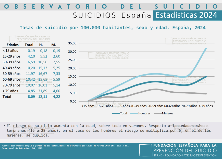 Aunque el mayor número de suicidios en ambos sexos se produce entre los 40 y los 59 años, el riesgo de suicidio aumenta con la edad, sobre todo en varones, que llega a multiplicarse por 7 respecto a las edades más tempranas.