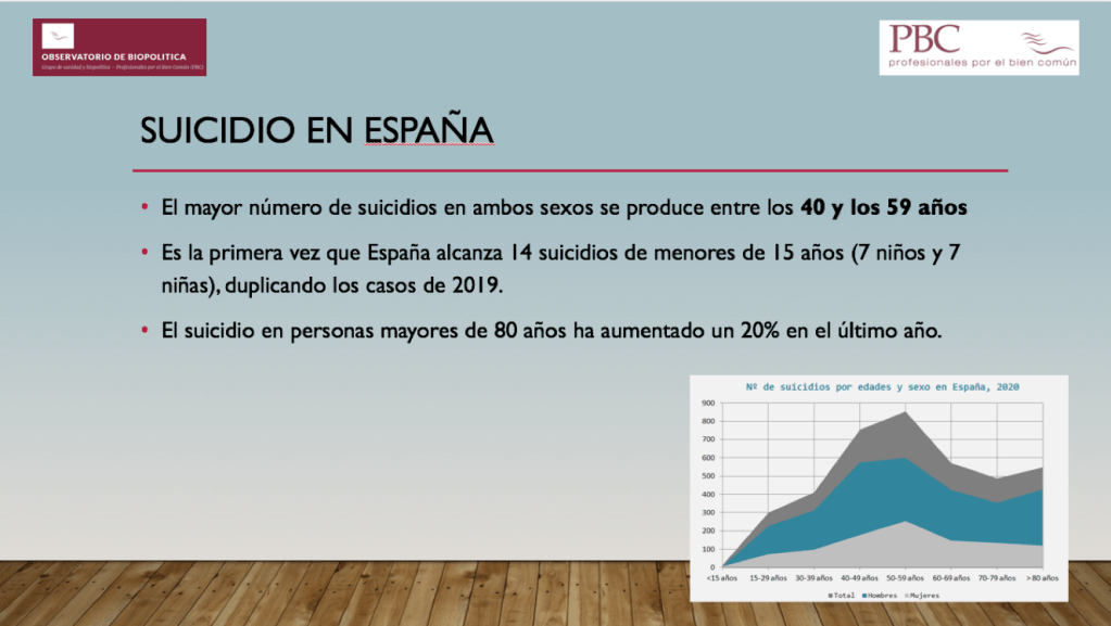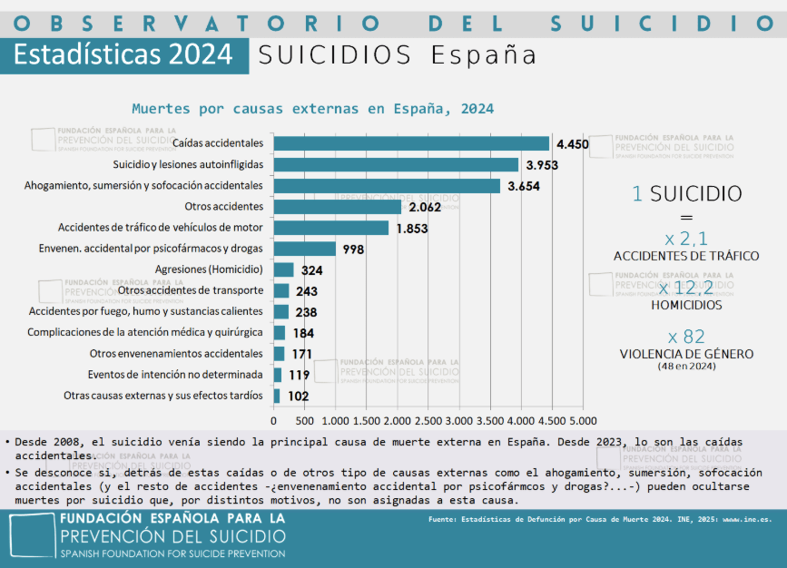 El suicidio sigue siendo la principal causa de muerte no natural en España, produciendo el doble de muertes que los accidentes de tráfico, 11 veces más que los homicidios y 72 veces más que la violencia de género, siendo también, después de los tumores, la principal causa de muerte en la juventud española (15 a 34 años).