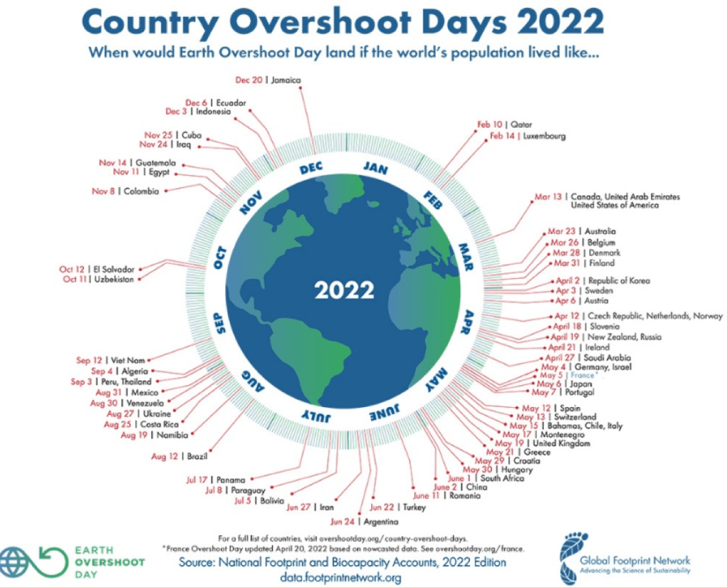 En el caso de España, en 2021, la sobrecapacidad se alcanzó el 25 de mayo. En 2022, ese día ha pasado a la primera quincena del mes: el día 12. Esa fecha, distinta para cada país, según su nivel de consumo y desarrollo, sigue la misma tendencia a nivel global[46] (Figura 4) y denota las diferencias que existen en las formas, estilos, prioridades, necesidades, modas, costumbres, creencias, modelos culturales… que condicionan distintos niveles de consumo, con impactos ambientales y sociales distintos, de unos países a otros[47].